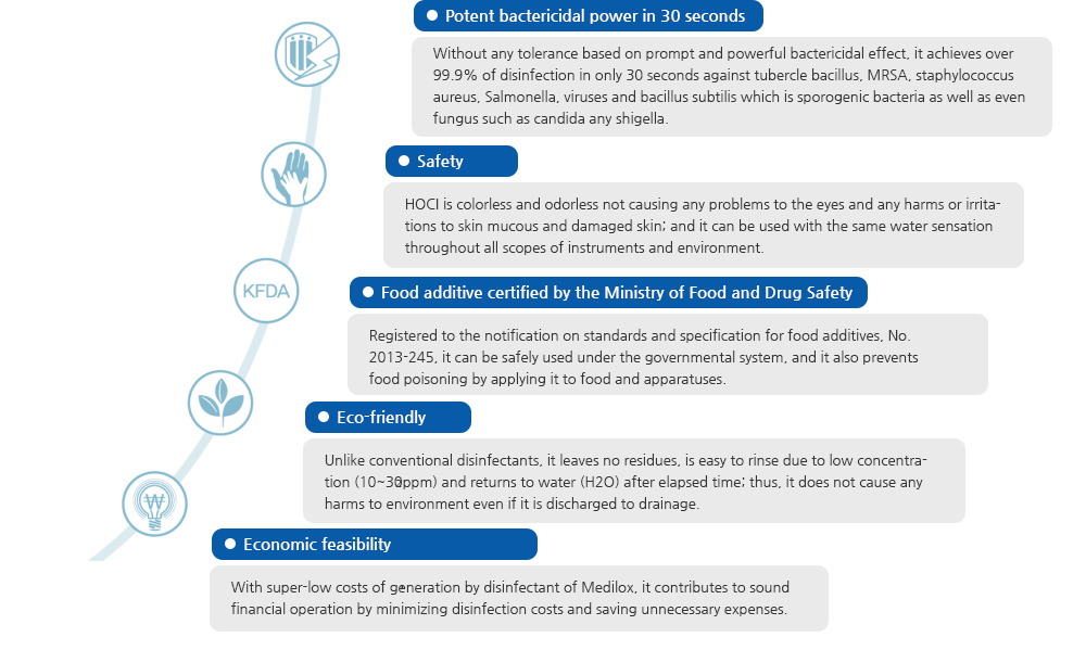 | Bactericidal power | General bacteria/pathogenic bacteria spore-forming bacteria/norovirus Sterilization in 30 seconds (80 times stronger than bleach) | Must be used after manufactured at high concentration | Vulnerable to sporogenic bacteria and fungus | Difficulty of guarantee due to unclear component specification of processing |