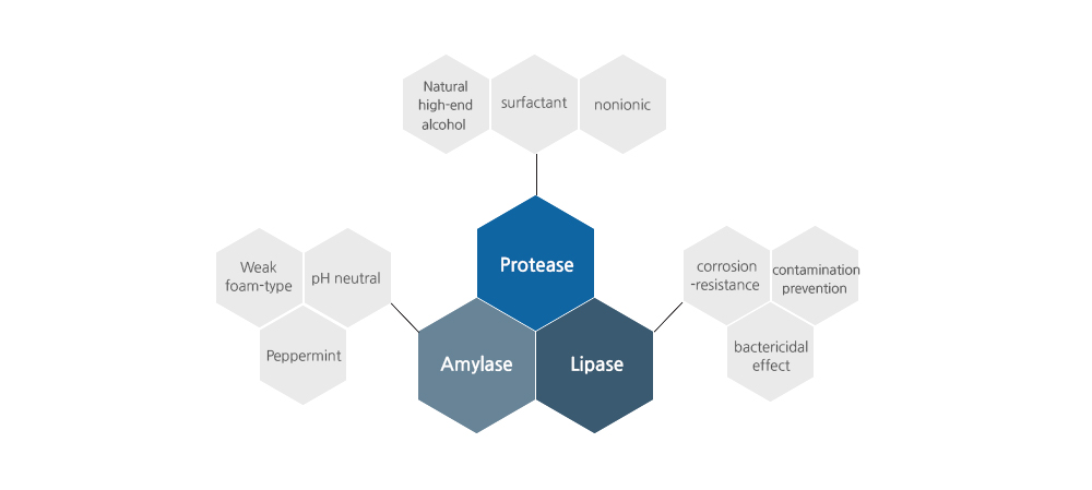 With enzyme ingredients (Protease, Amylase and Lipase), it is possible to display exceptional washing effect by promptly decomposing bio-film, which incurs critical infection to human body and is impossible to remove with single enzyme, through 3 conjugated.